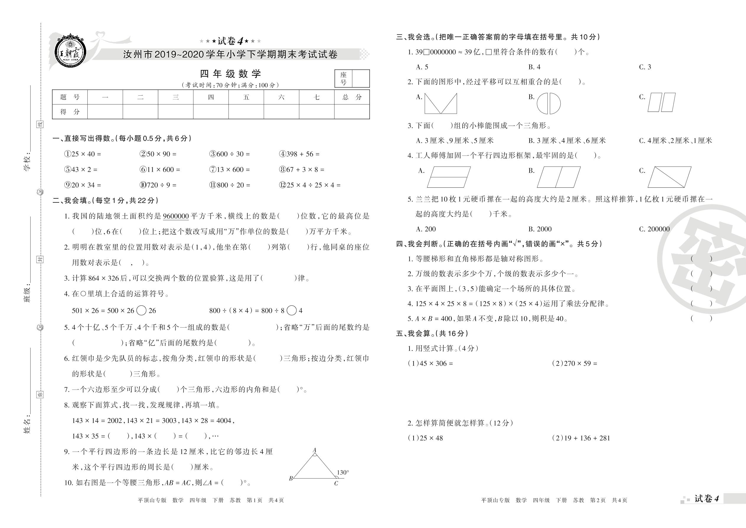 2019-2020学年第二学期汝州市四年级数学试卷(苏教版)【4】