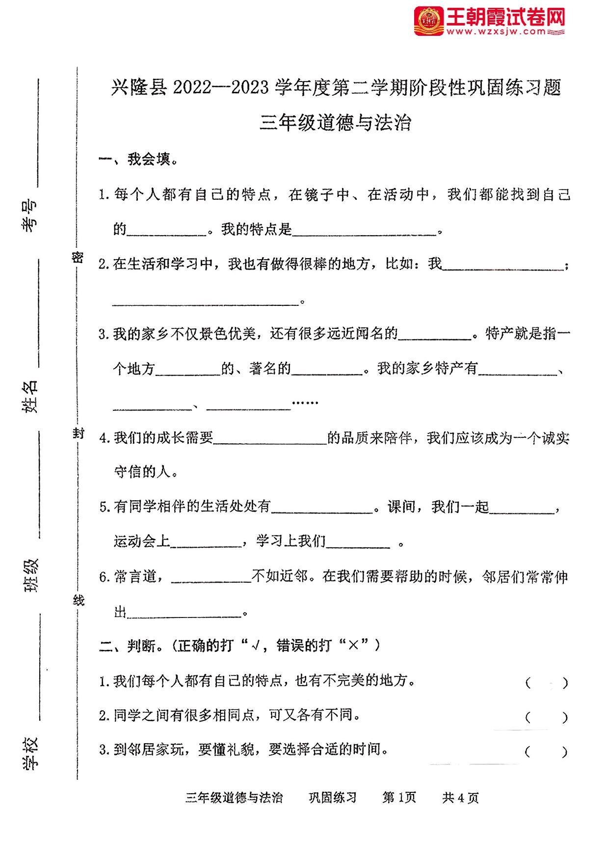 河北省承德市兴隆县2022-2023学年度第二学期阶段性巩固练习期中试卷三年级道德与法治(人教版)