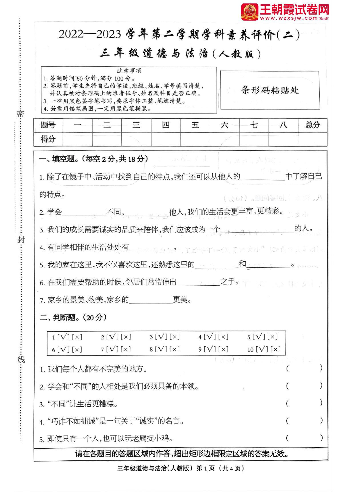 河北省邢台市临城县2022-2023学年第二学期期中学科素养评价三年级道德与法治(人教版)