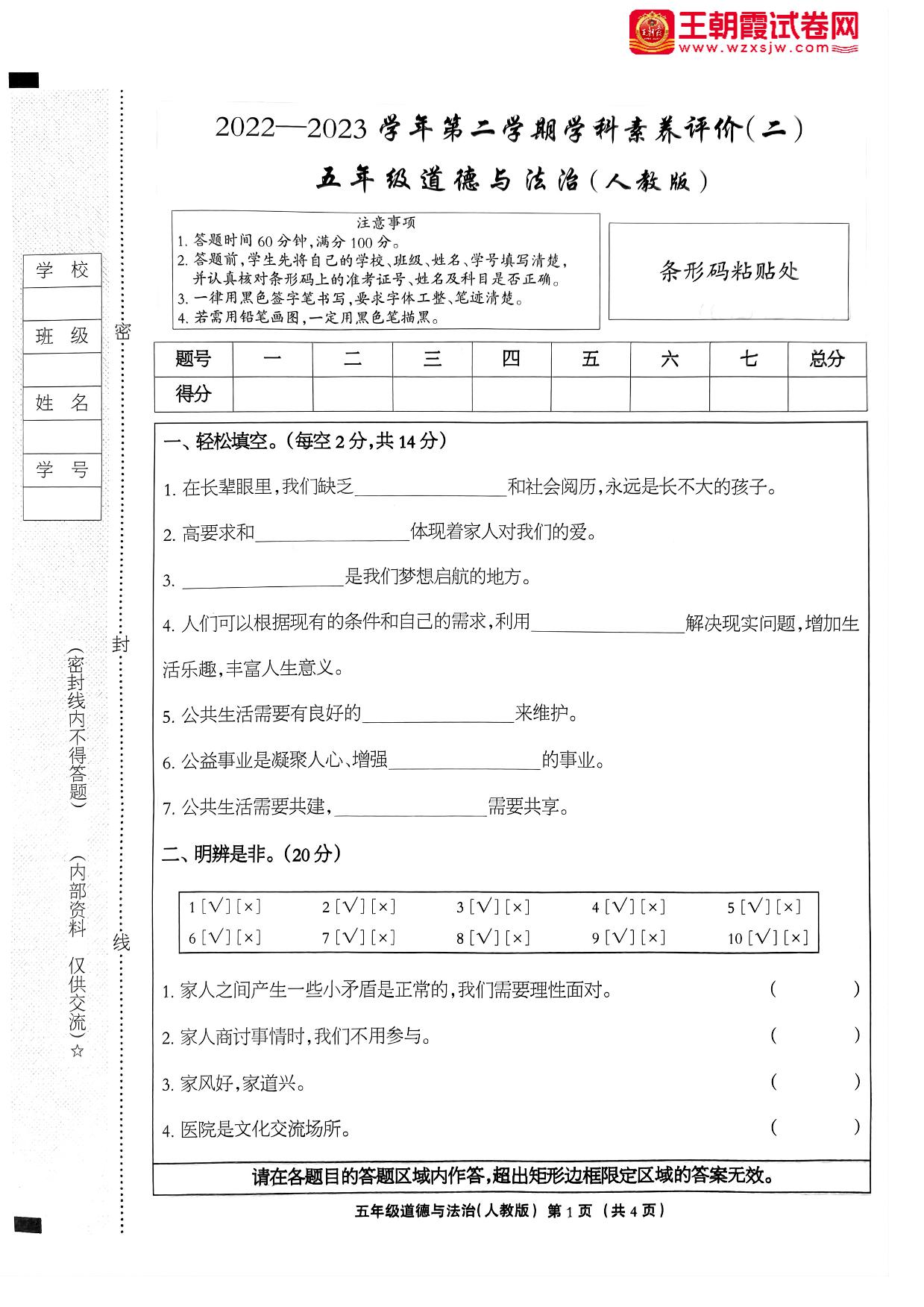 河北省邢台市临城县2022-2023学年第二学期期中学科素养评价五年级道德与法治(人教版)