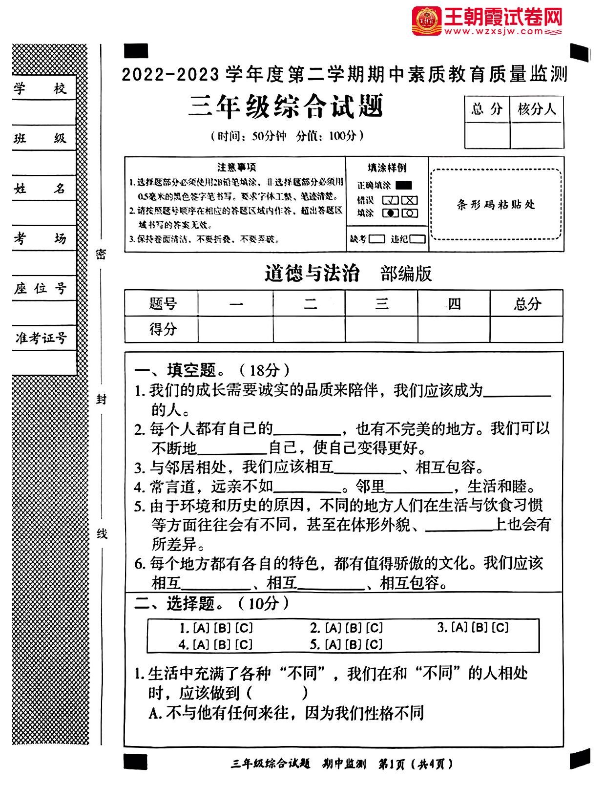 河北省邢台市威县2022-2023学年度第二学期期中素质教育质量监测试题三年级道德与法治(人教版)