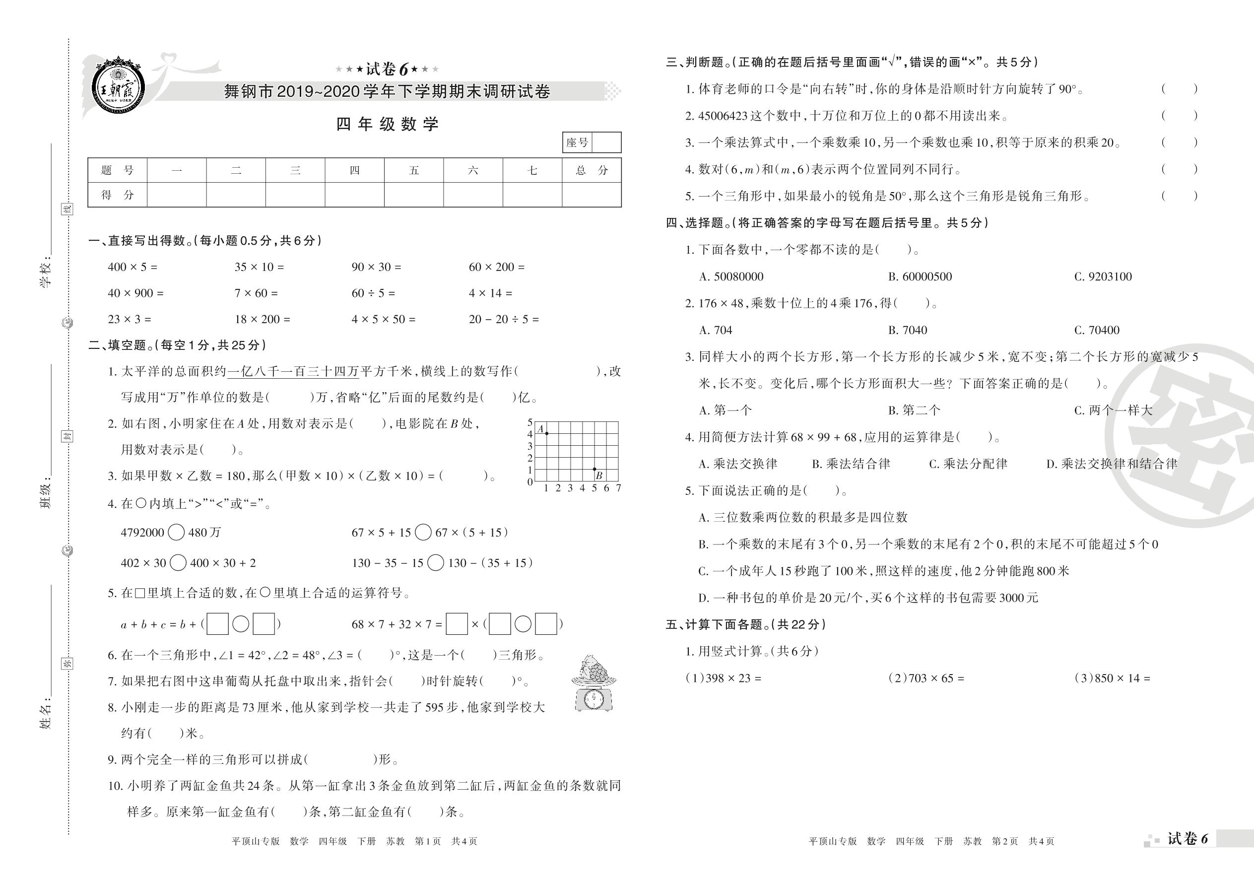 2019-2020学年第二学期舞钢市四年级数学试卷(苏教版)【6】