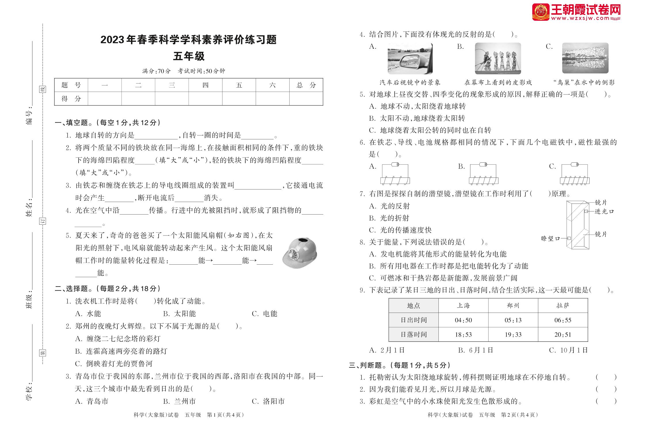河南省洛阳市嵩县2022—2023学年下学期期中学科素养评价练习题五年级科学(大象版)