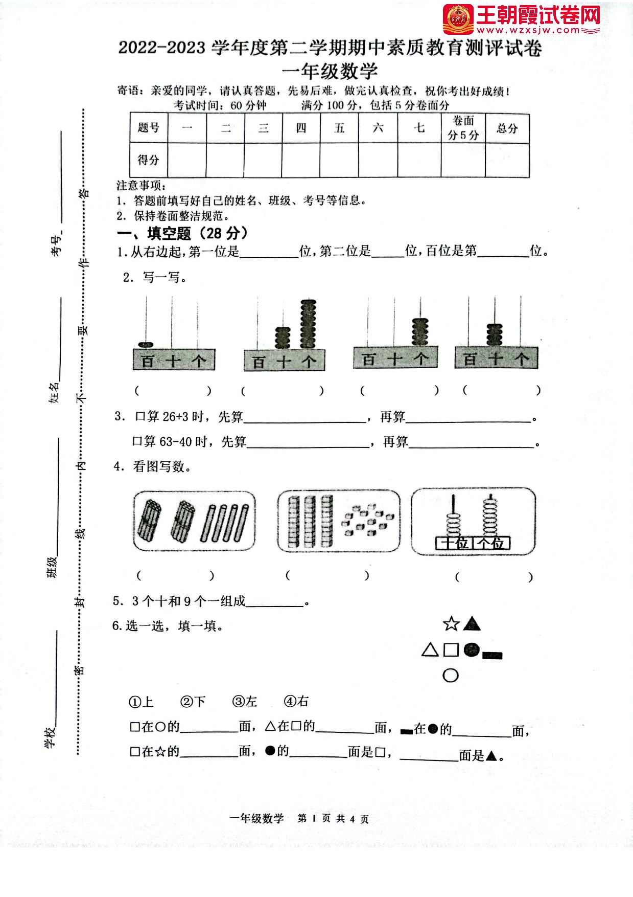 河南省周口市项城市2022—2023学年下学期期中素质教育测评试卷一年级数学(西师版)