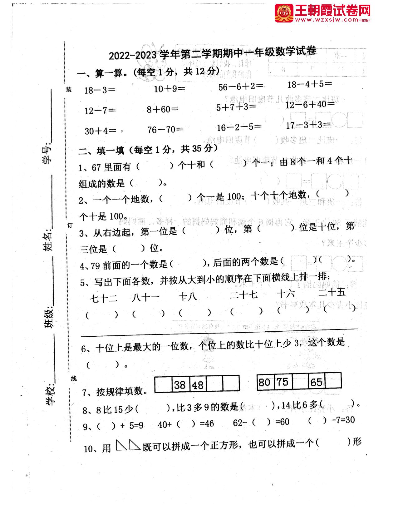 一年级数学人教版下册期中卷