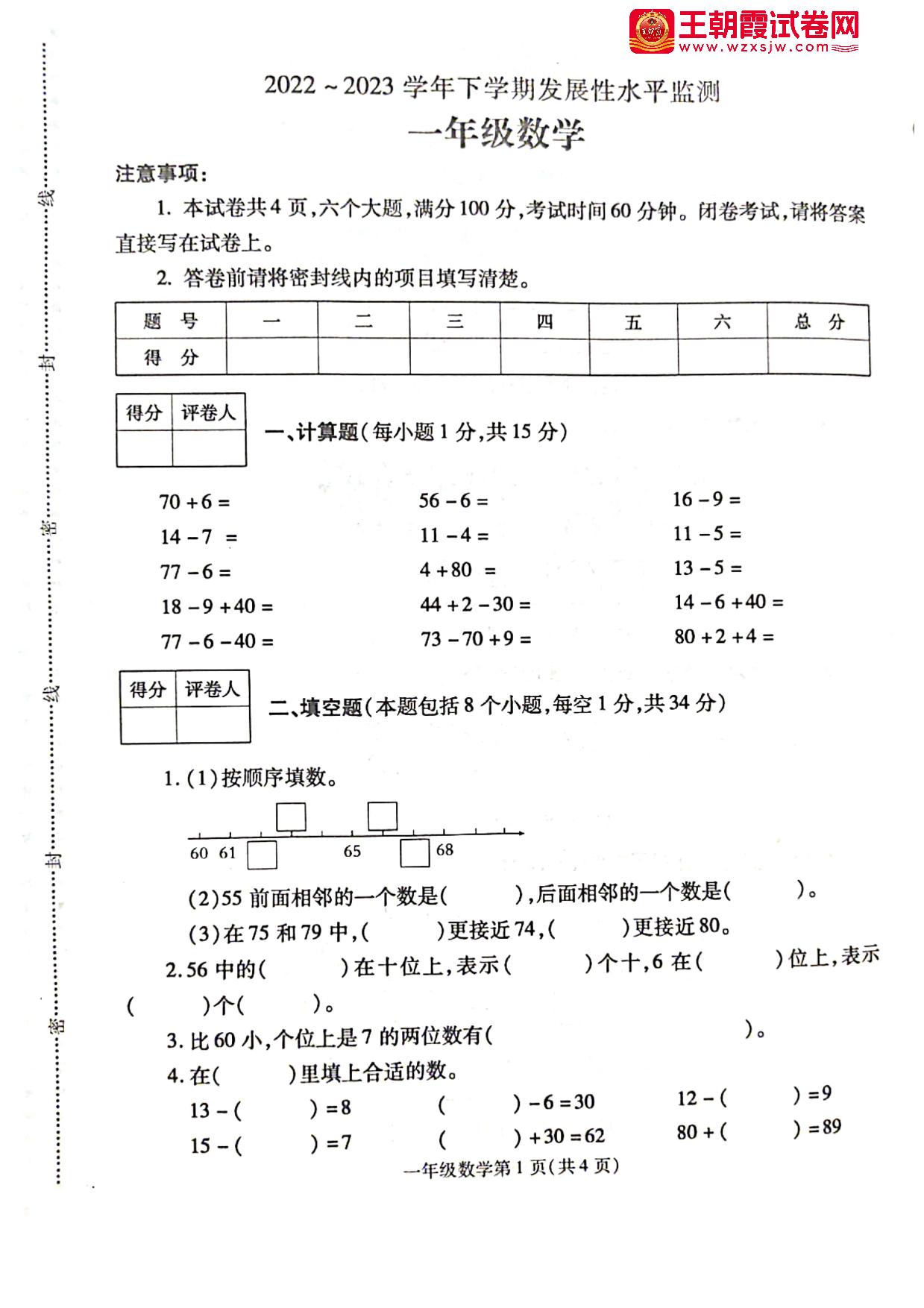 河南省漯河市舞阳县2022—2023学年下学期期中发展性水平监测试题一年级数学(人教版)