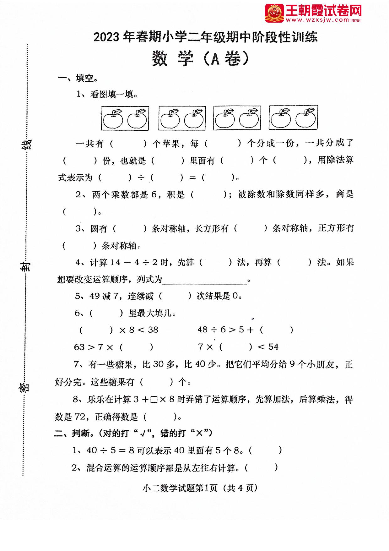 河南省南阳市镇平县联合小学2022—2023学年下学期期中阶段性训练二年级数(人教版)