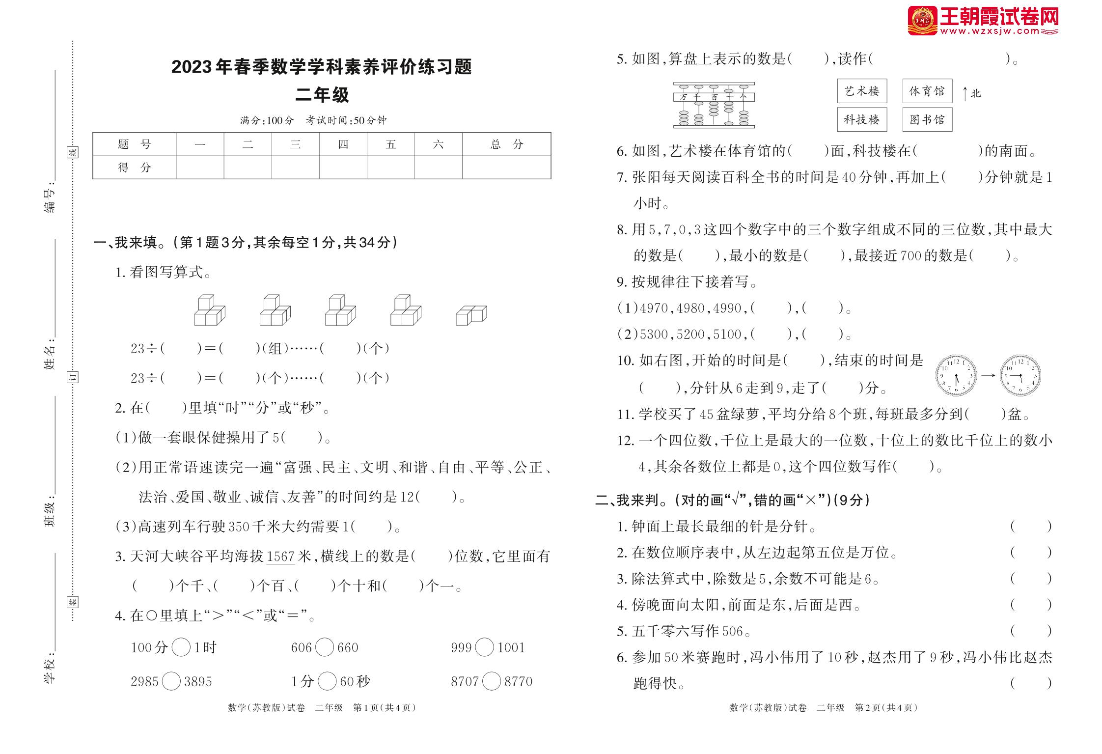 河南省平顶山市鲁山县2022—2023学年下学期期中学科素养评价练习题二年级数学(苏教版)