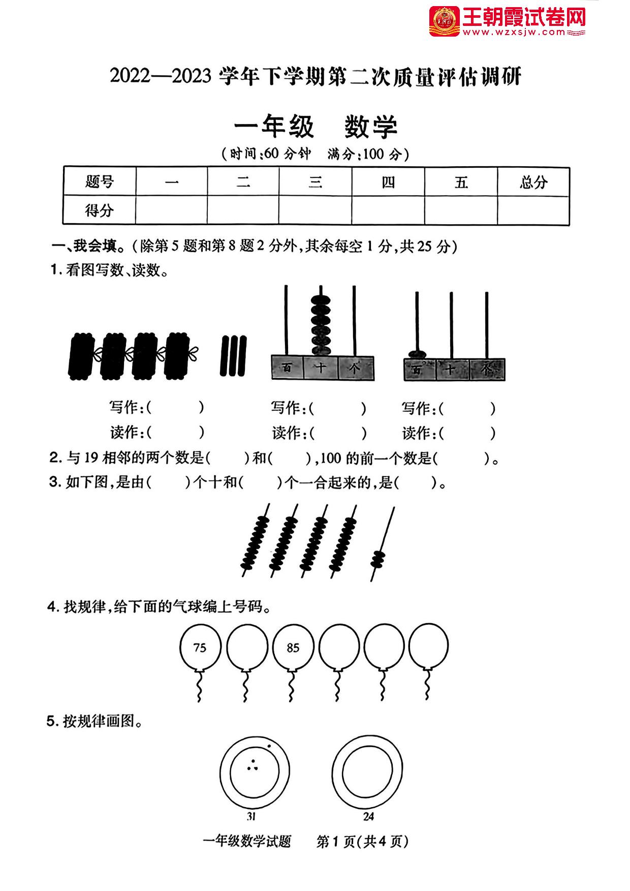 河南省信阳市平桥区2022—2023学年下学期期中质量评估调研试题一年级数学(人教版)