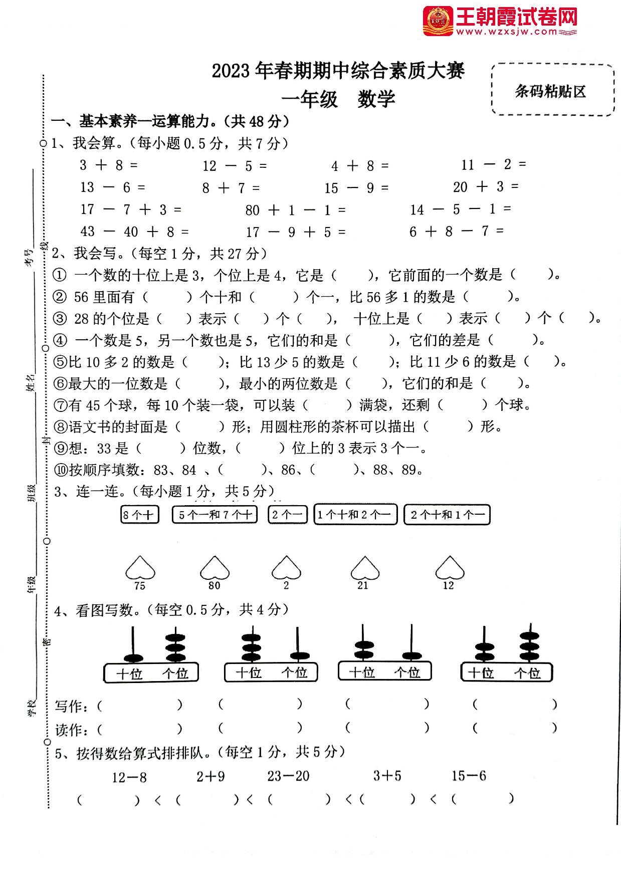 河南省驻马店市确山县2022—2023学年下学期期中综合素质大赛一年级数学(人教版)