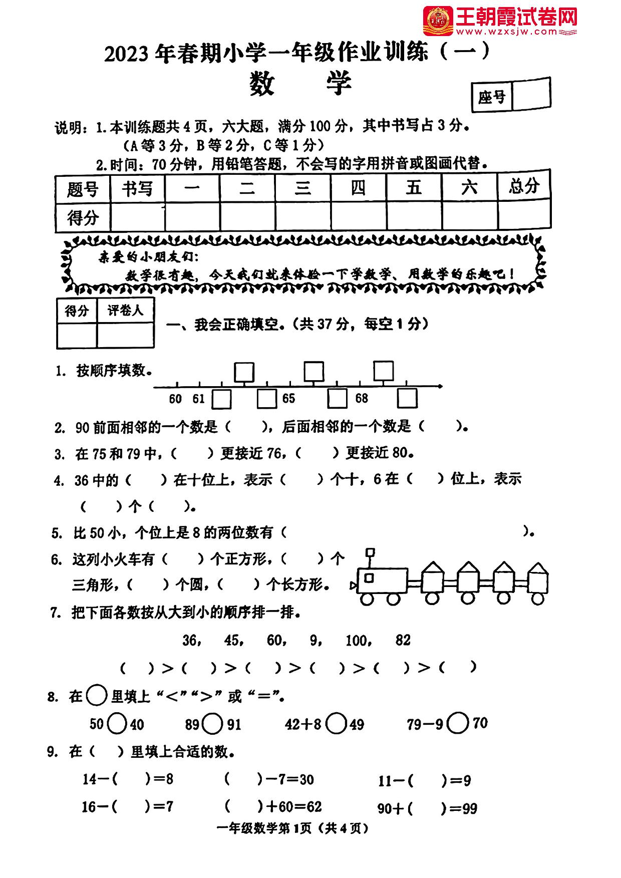 河南省南阳市新野县2022—2023学年下学期期中作业训练试题一年级数学(人教版)