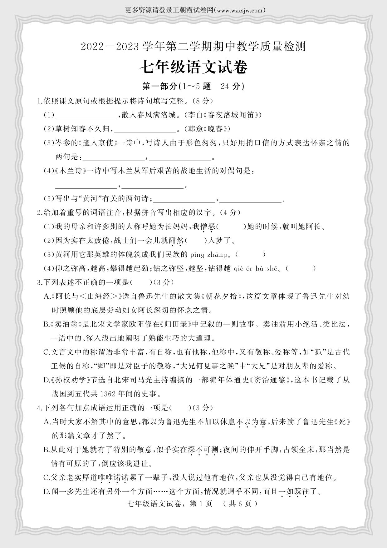 河北省石家庄市高邑县2022-2023学年第二学期期中教学质量检测试卷七年级语文(人教版)