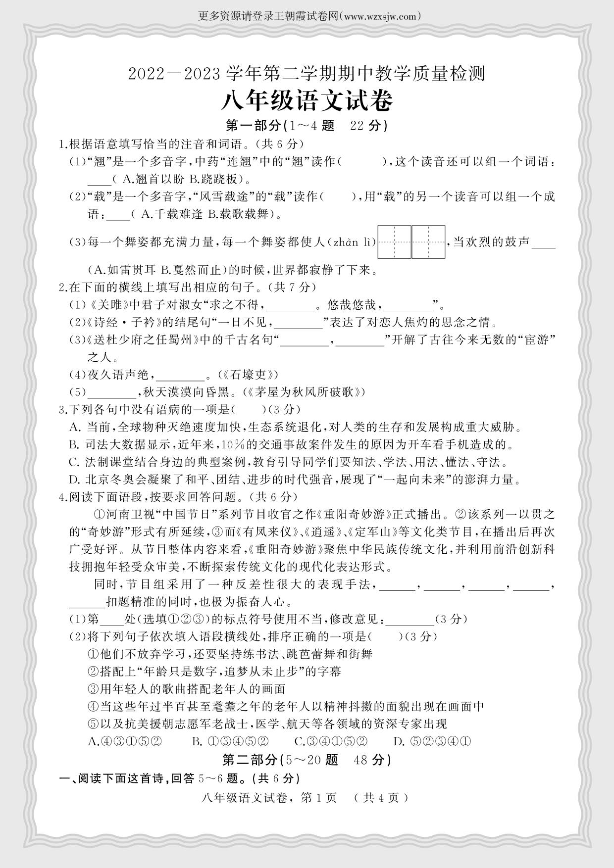 河北省石家庄市高邑县2022-2023学年第二学期期中教学质量检测试卷八年级语文(人教版)