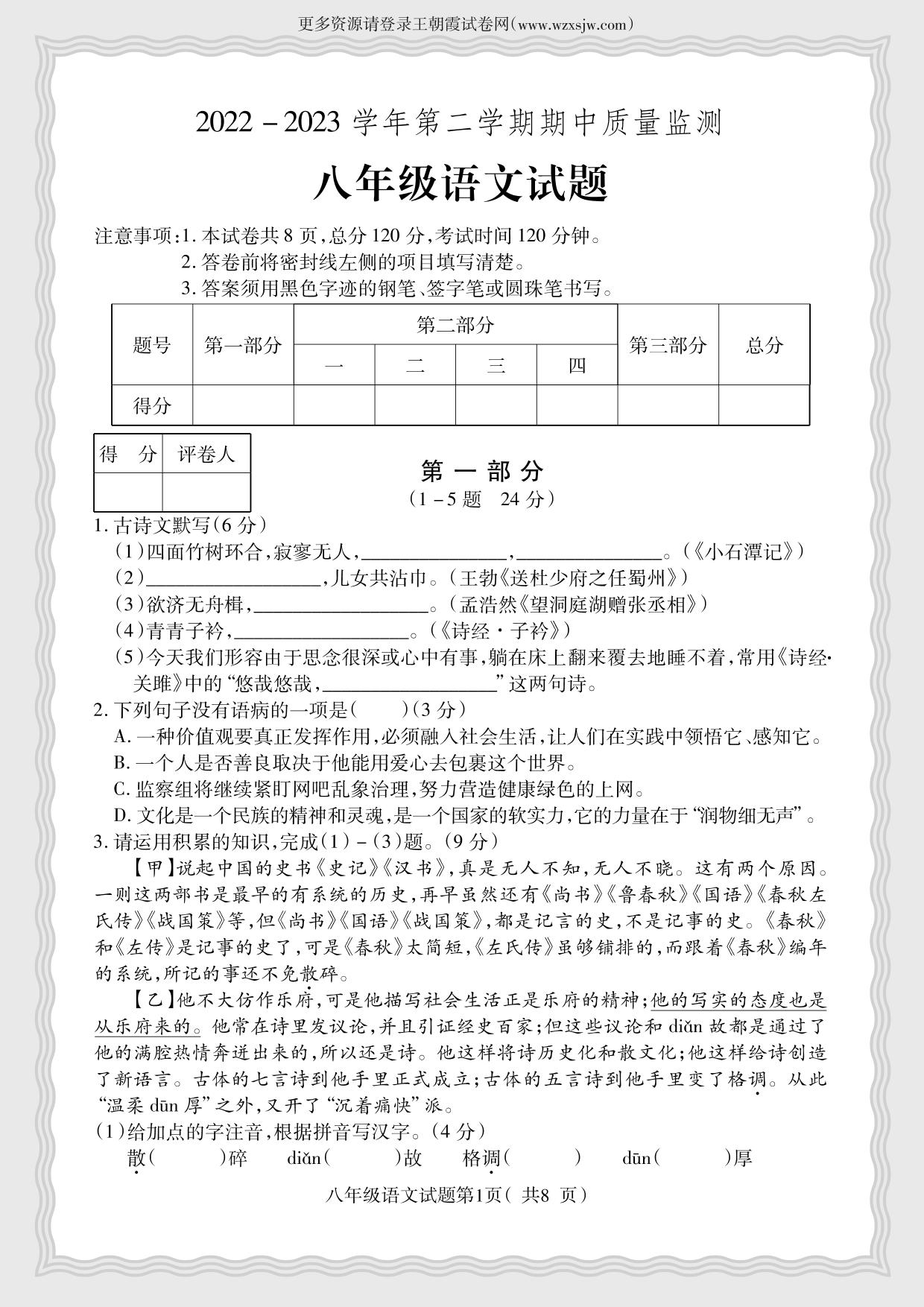 八年级语文人教版下册期中卷