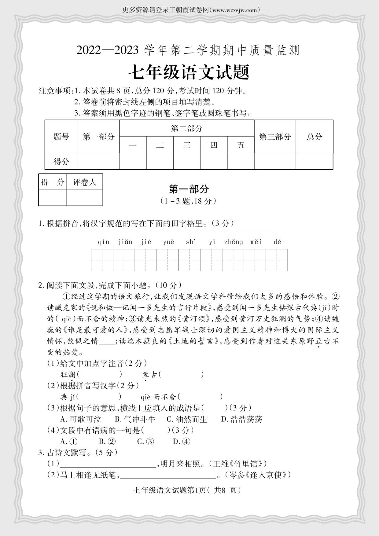 河北省保定市定州市2022-2023学年第二学期期中质量监测试题七年级语文(人教版)