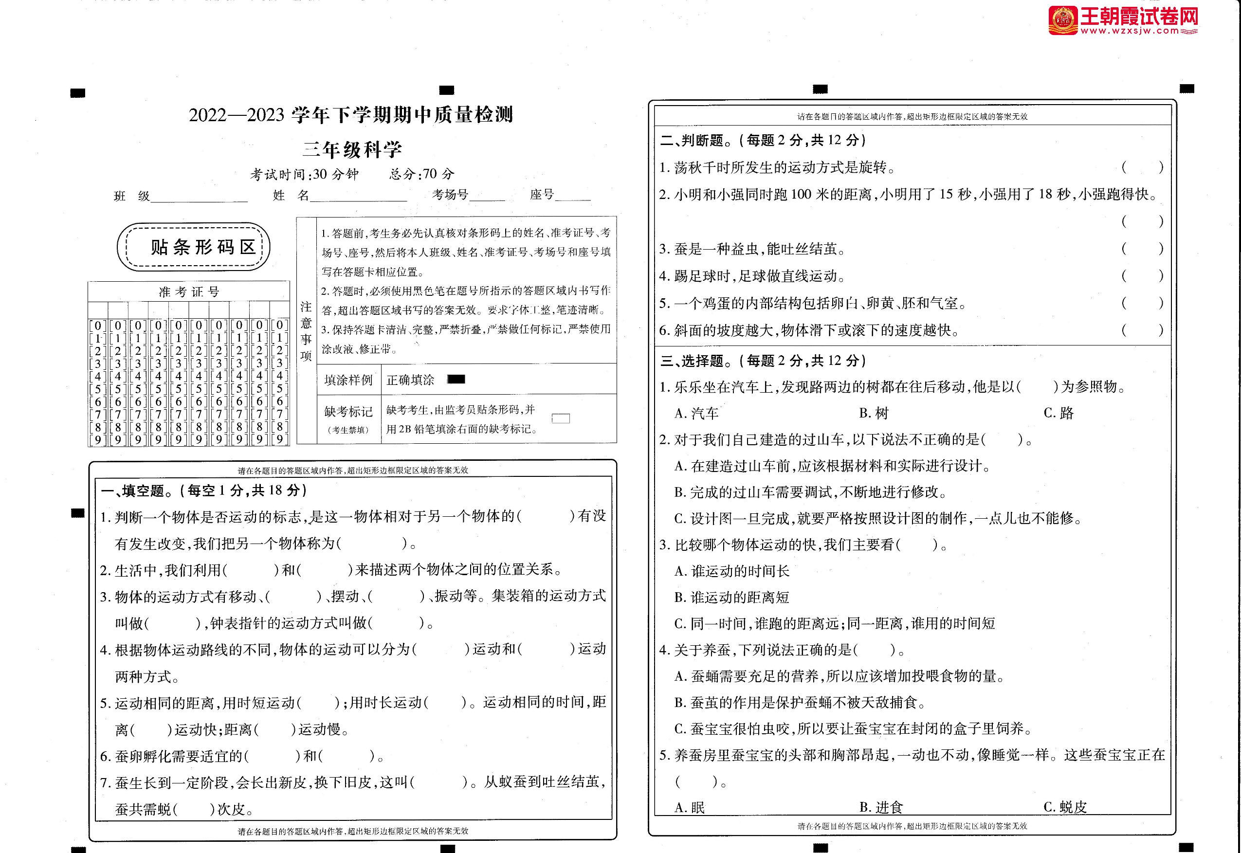 河南省驻马店市上蔡县和店镇2022—2023学年下学期期中考试卷三年级科学(教科版)