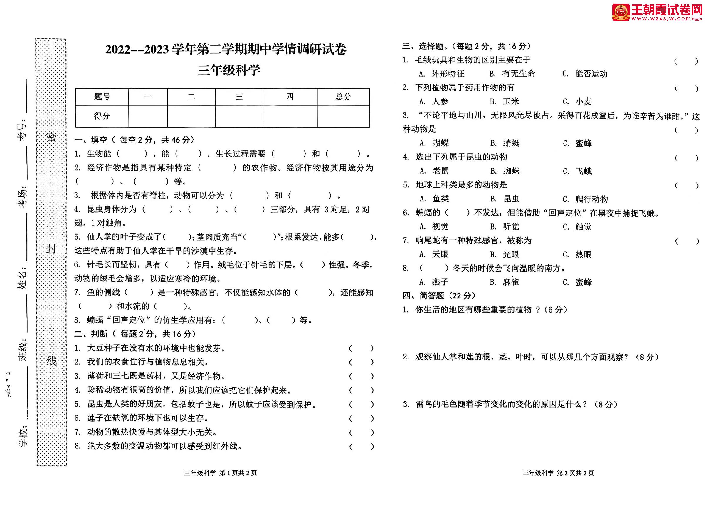 河南省周口市郸城县2022—2023学年下学期4月期中试题三年级科学(冀人版)