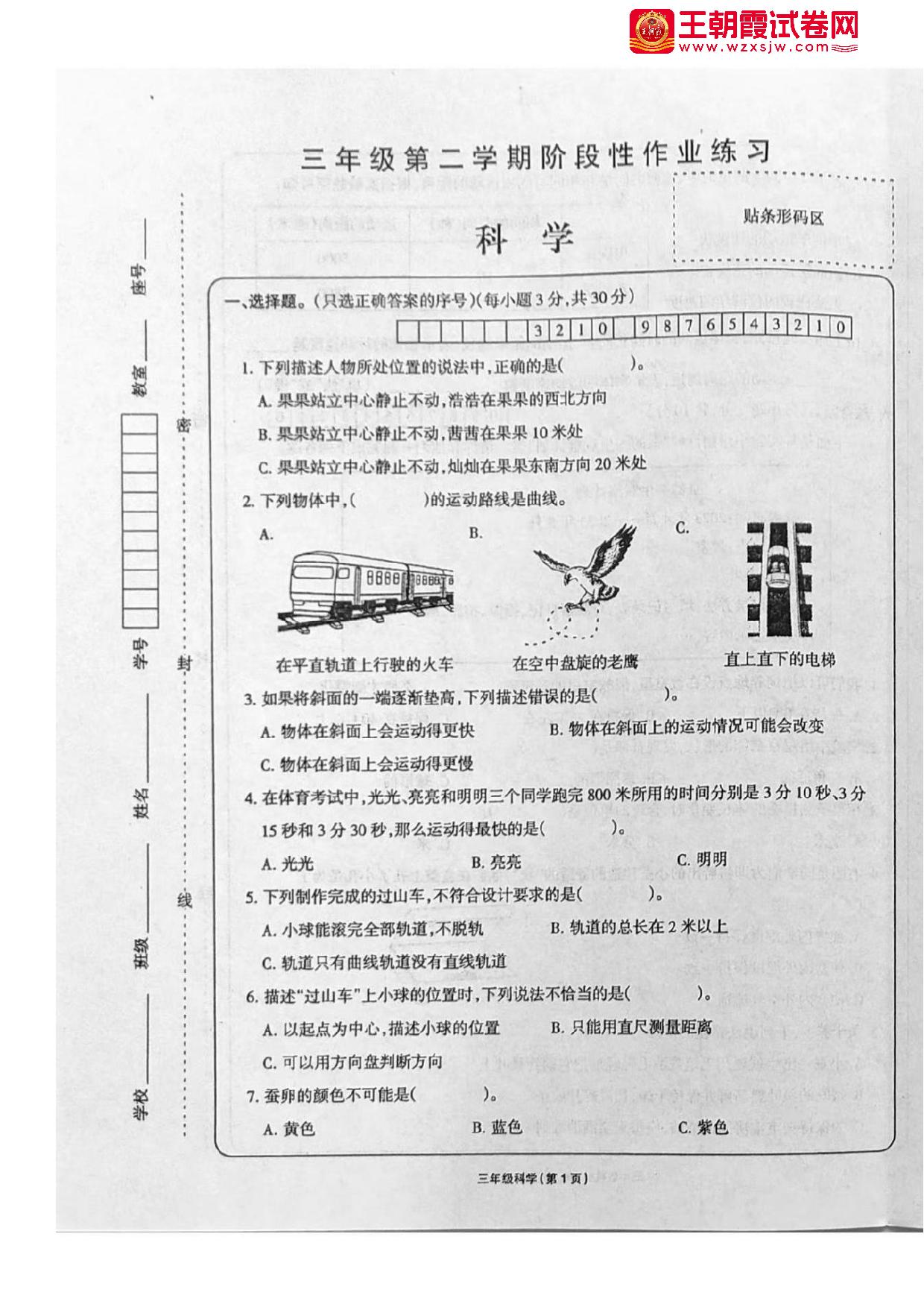三年级科学教科版下册期中卷