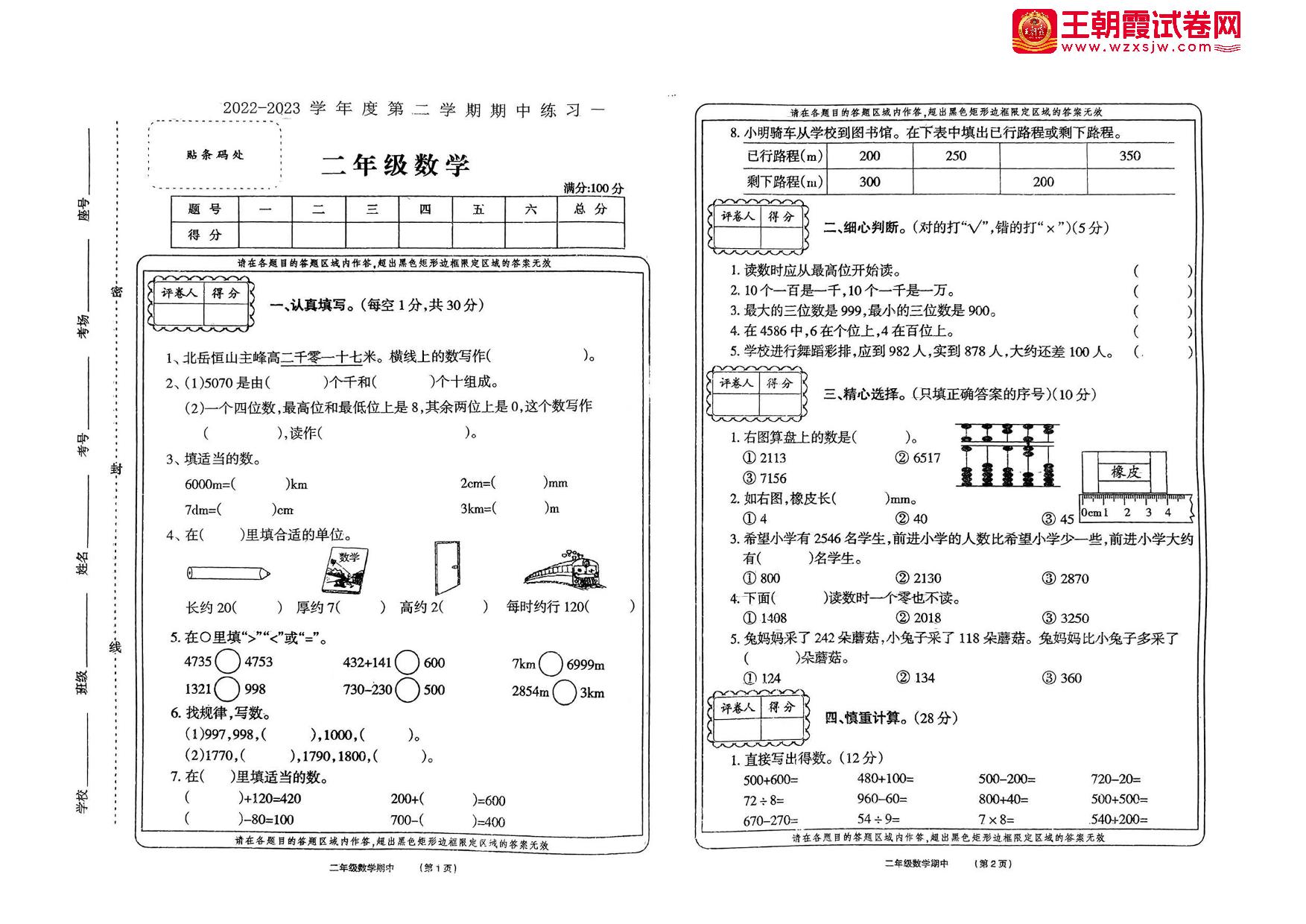 河南省周口市沈丘县2022—2023学年下学期4月期中试题二年级数学(西师版)