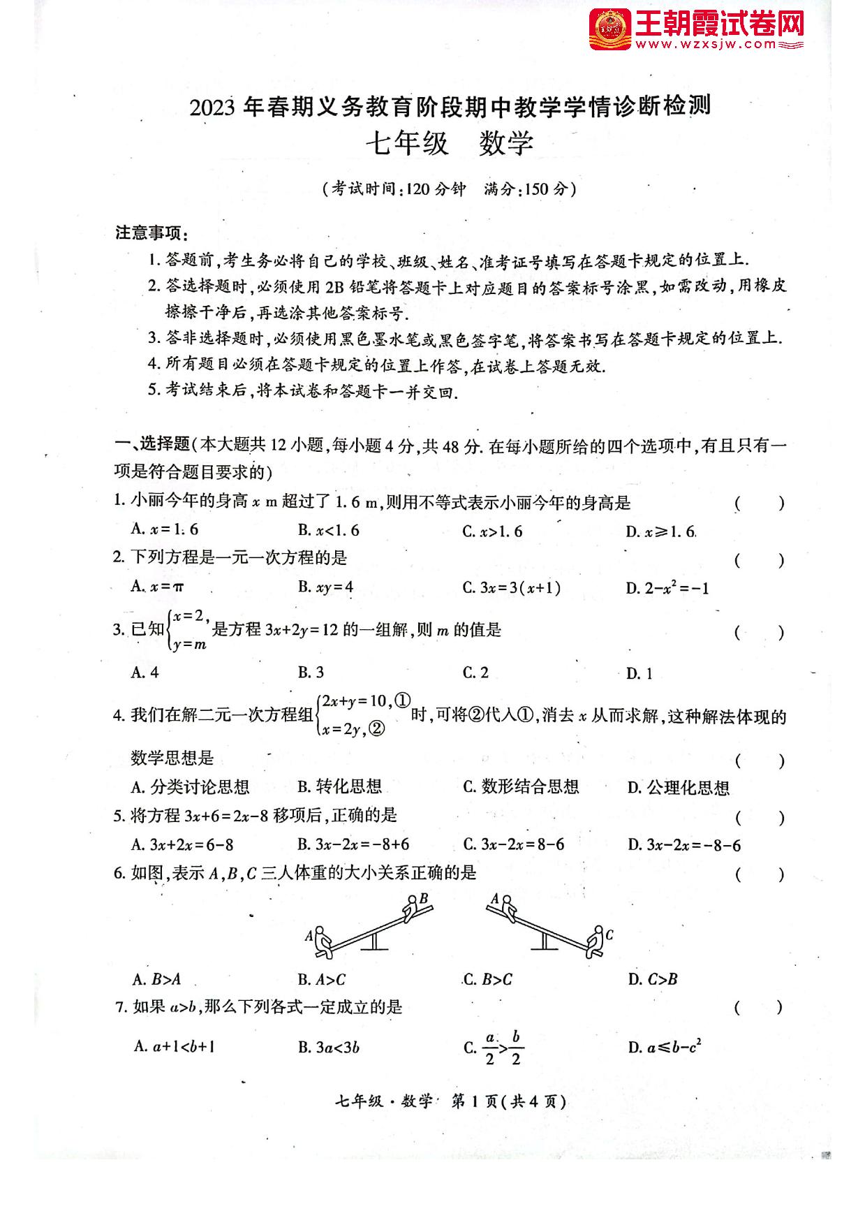 四川省宜宾市兴文县2022-2023学年下学期期中学情诊断检测七年级数学(华师版)