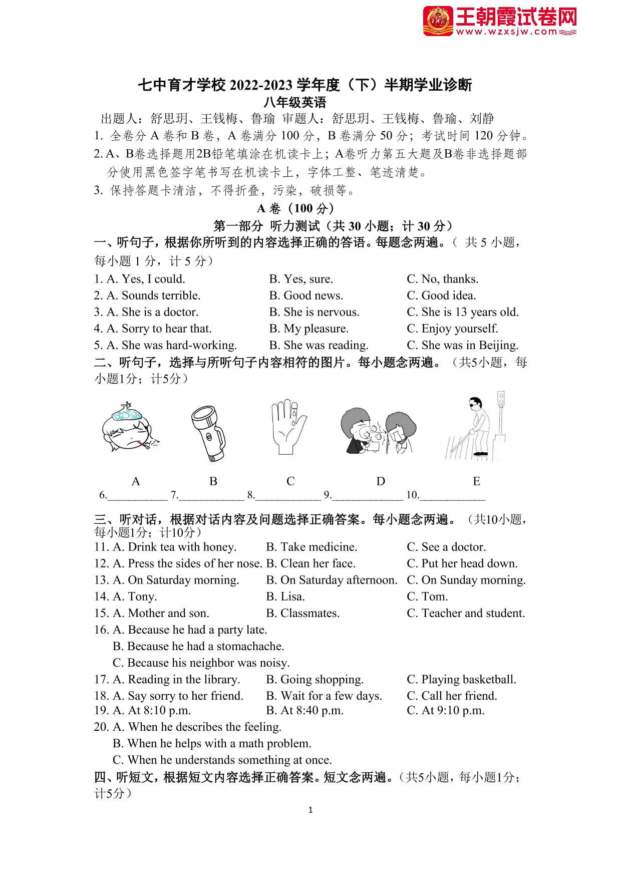 四川省成都市七中育才学校2022-2023学年下学期期中质量监测八年级英语(人教版)
