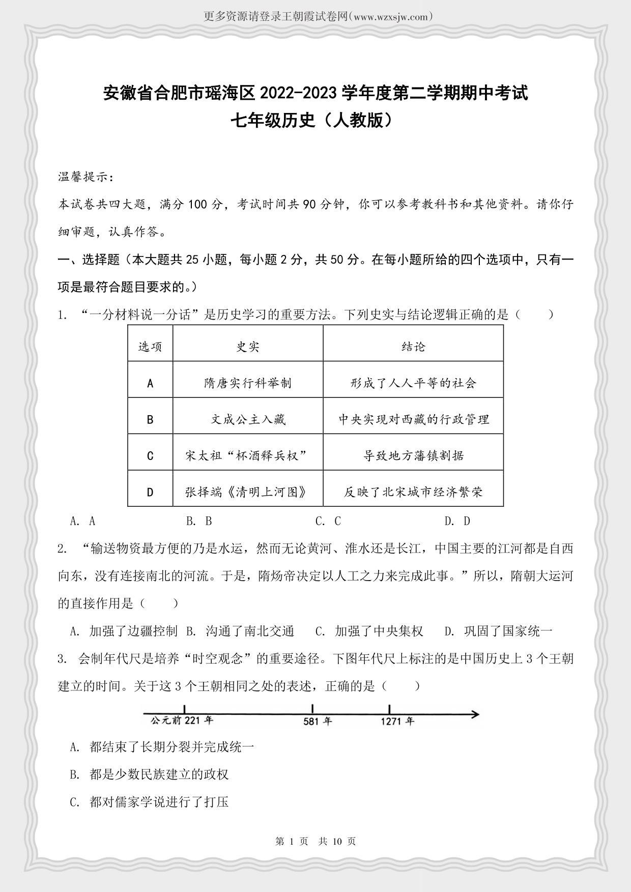 安徽省合肥市瑶海区2022-2023学年度第二学期期中考试七年级历史(人教版)