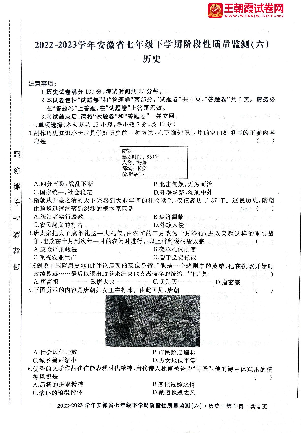 安徽省亳州市第十一中学2022-2023学年下学期期中阶段性质量检测七年级历史(人教版)