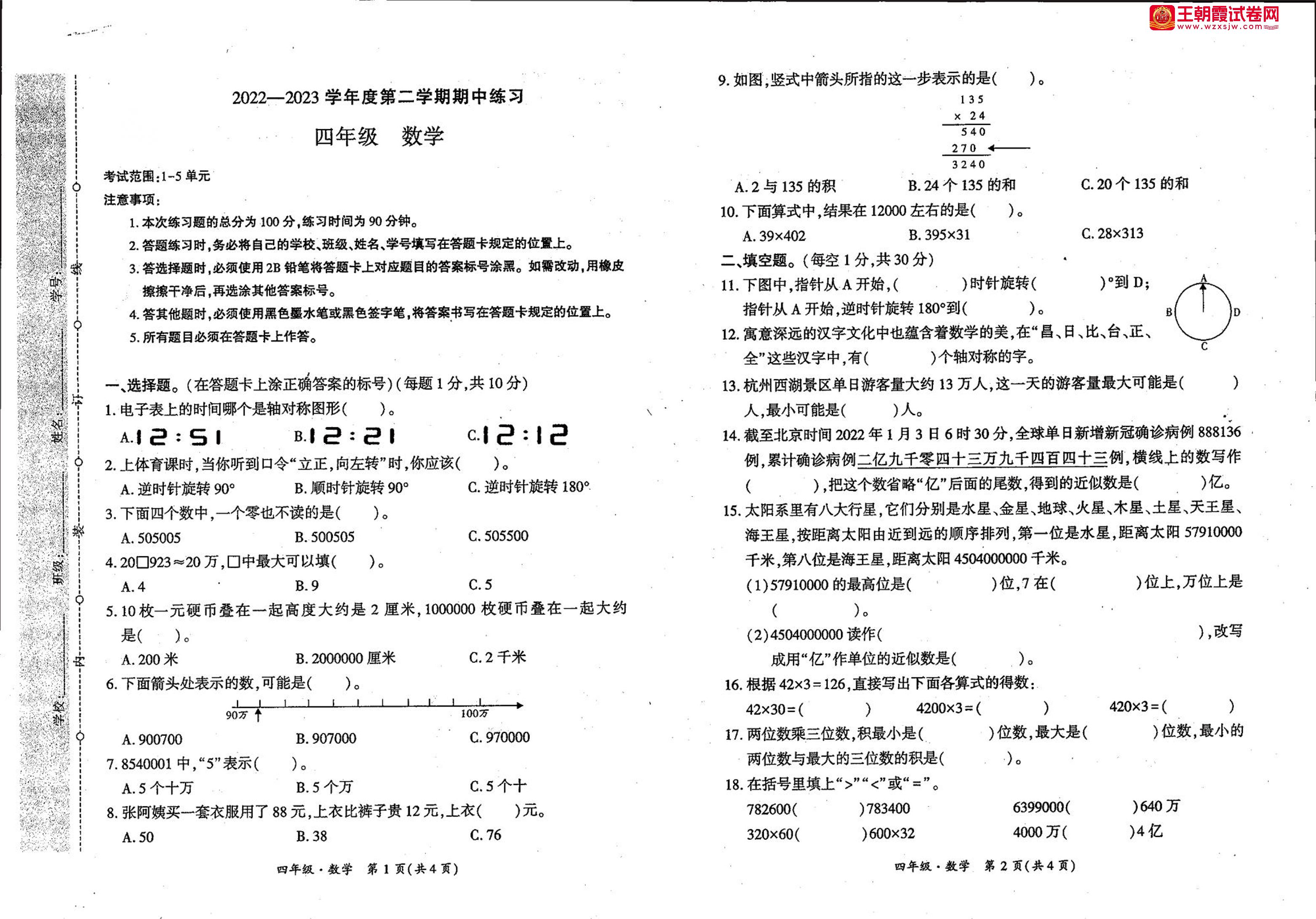 贵州省贵阳市云岩区2022-2023学年度第二学期期中练习四年级数学(苏教版)