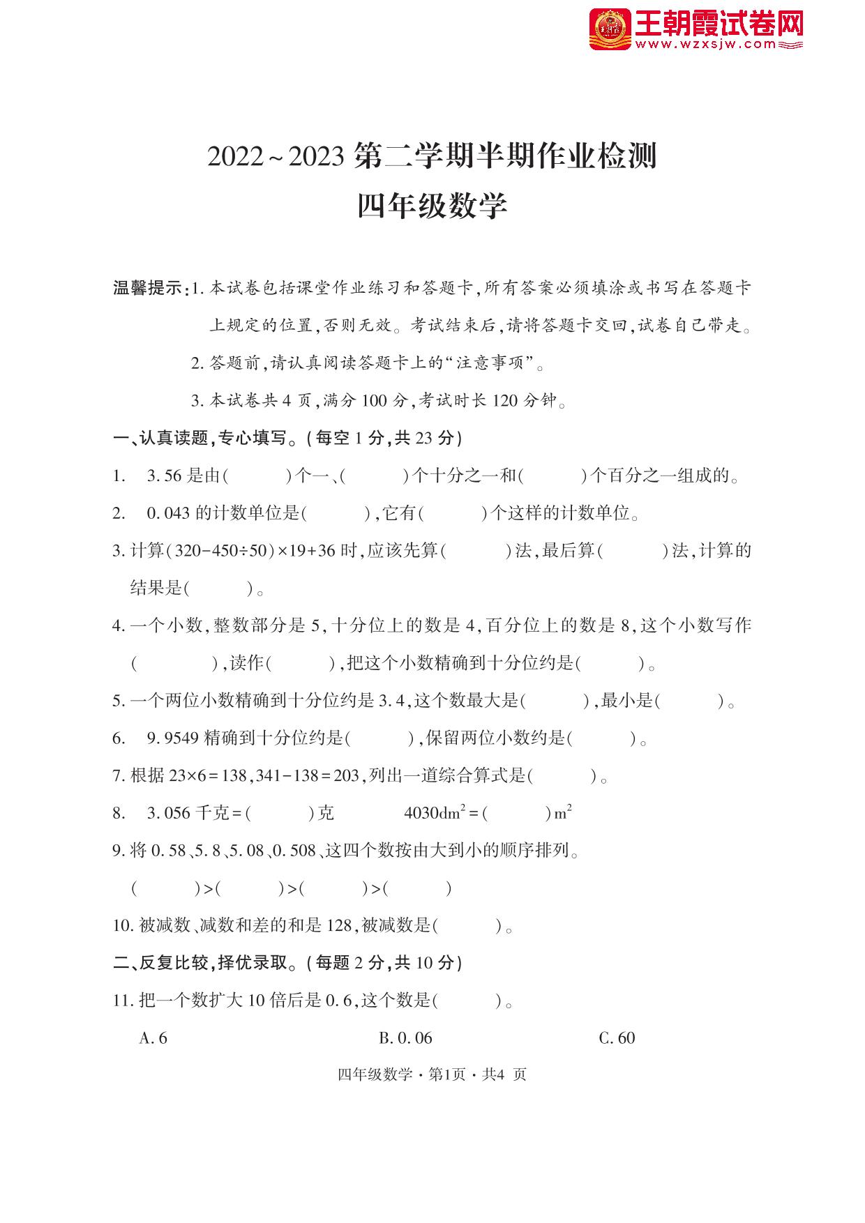 四年级数学人教版下册期中卷