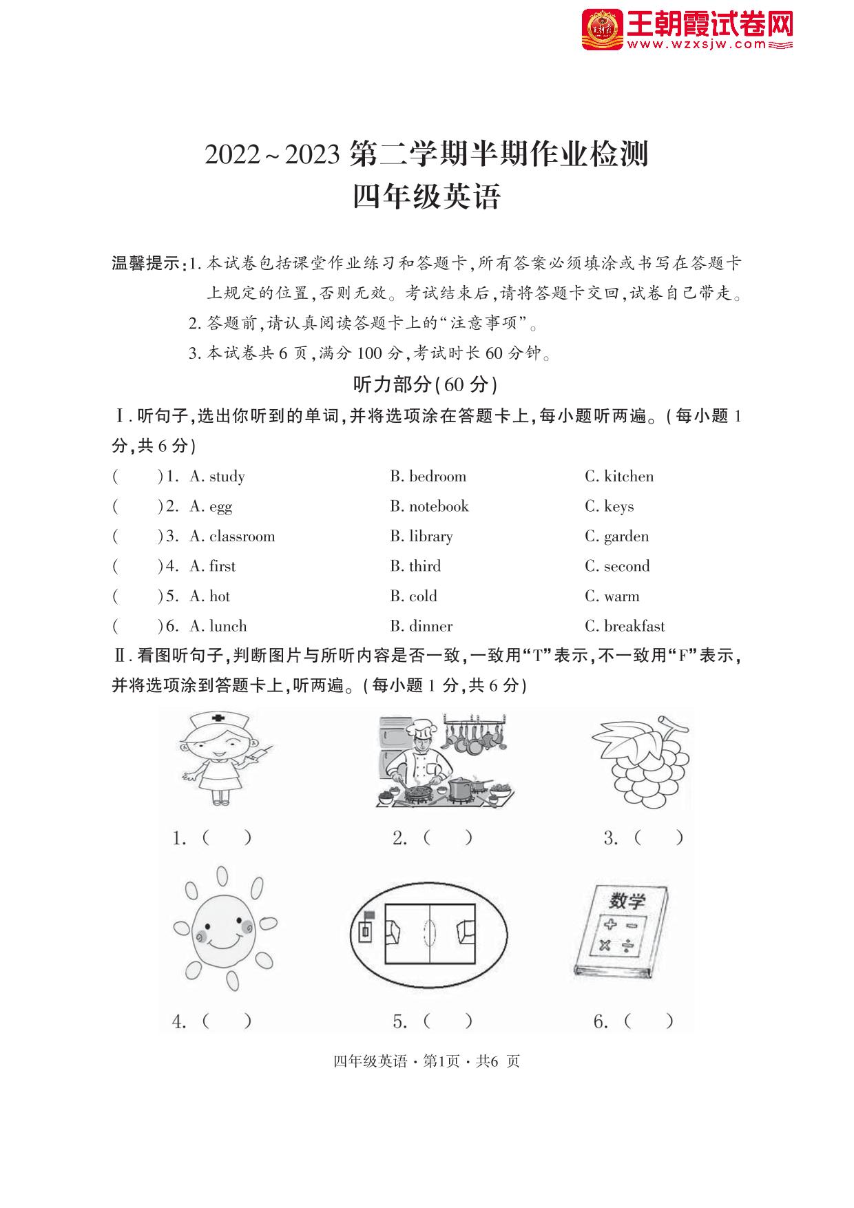 四年级英语人教PEP版(三起始)下册期中卷