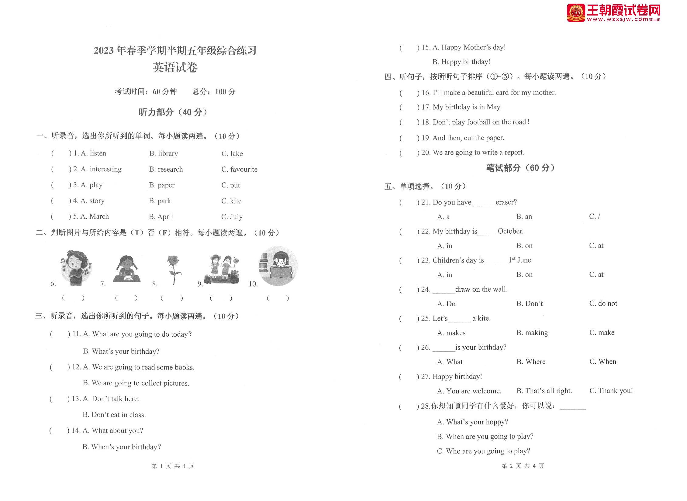 贵州省铜仁市松桃县2022-2023学年度下学期期中综合练习五年级英语(湘少版)