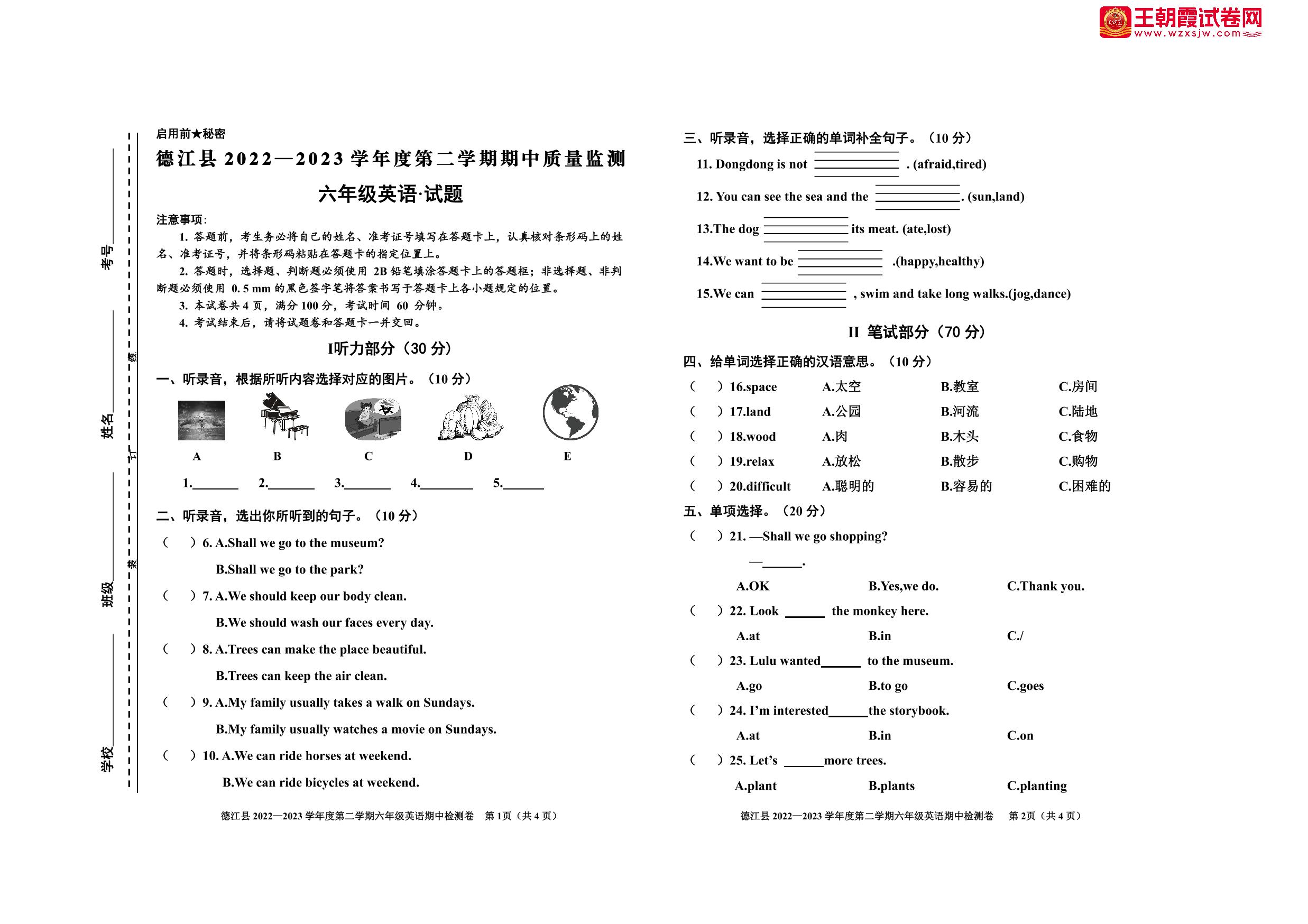 贵州省铜仁市德江县2022-2023学年度第二学期期中质量监测六年级英语(湘少版)【无听力音频】