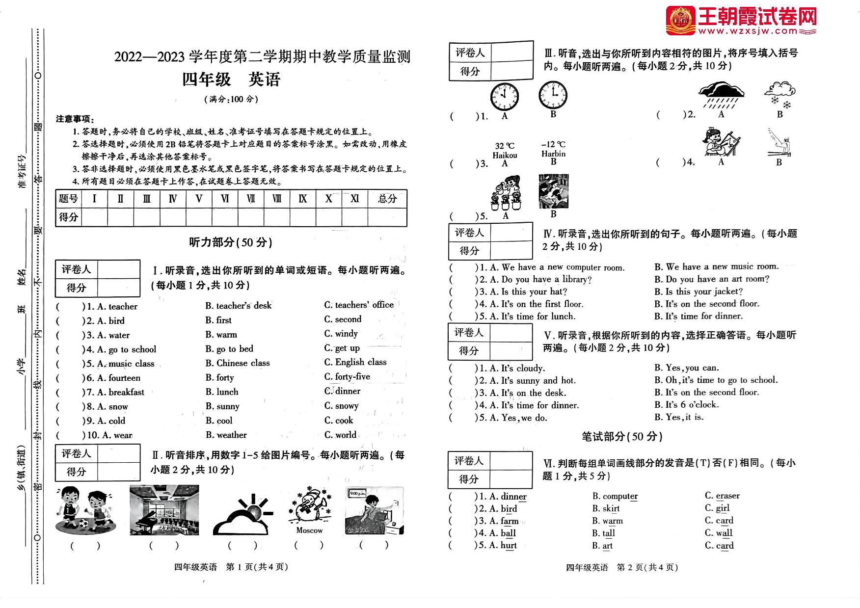 贵州省六盘水市2022-2023学年第二学期期中教学质量监测四年级英语(PEP版)【无听力音频】