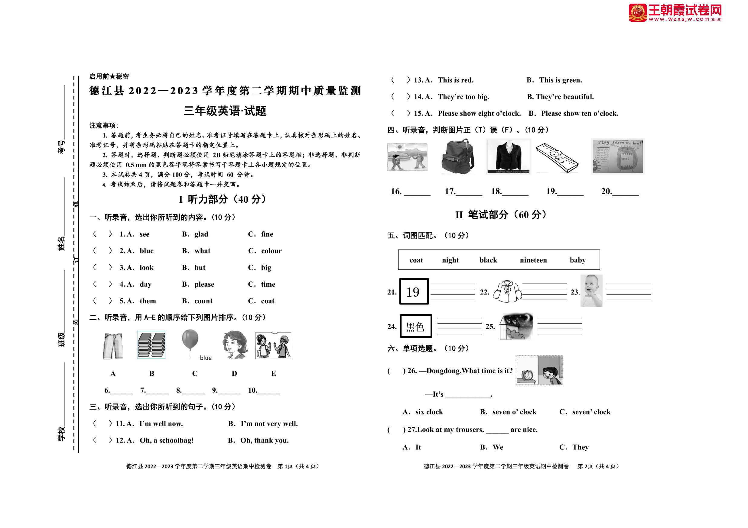 贵州省铜仁市德江县2022-2023学年度第二学期期中质量监测三年级英语(湘少版)【无听力音频】