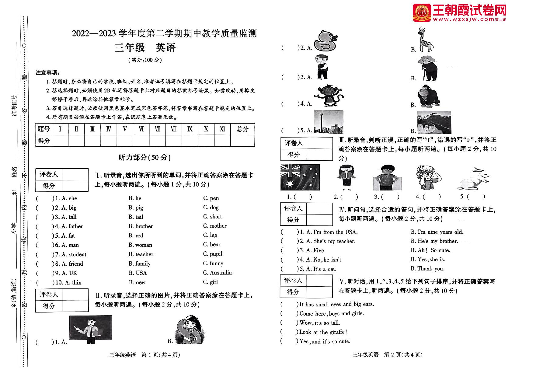 贵州省六盘水市2022-2023学年第二学期期中教学质量监测三年级英语(PEP版)【无听力音频】