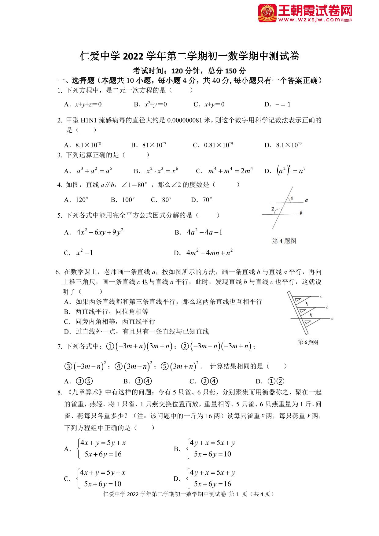 七年级数学浙教版下册期中卷