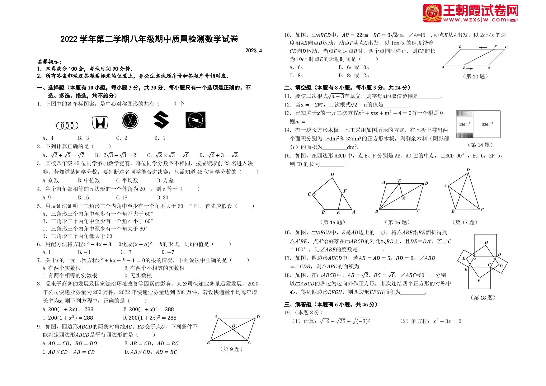 浙江省温州市瑞安五校l联考2022-2023学年第二学期期中测试试题八年级数学(浙教版)