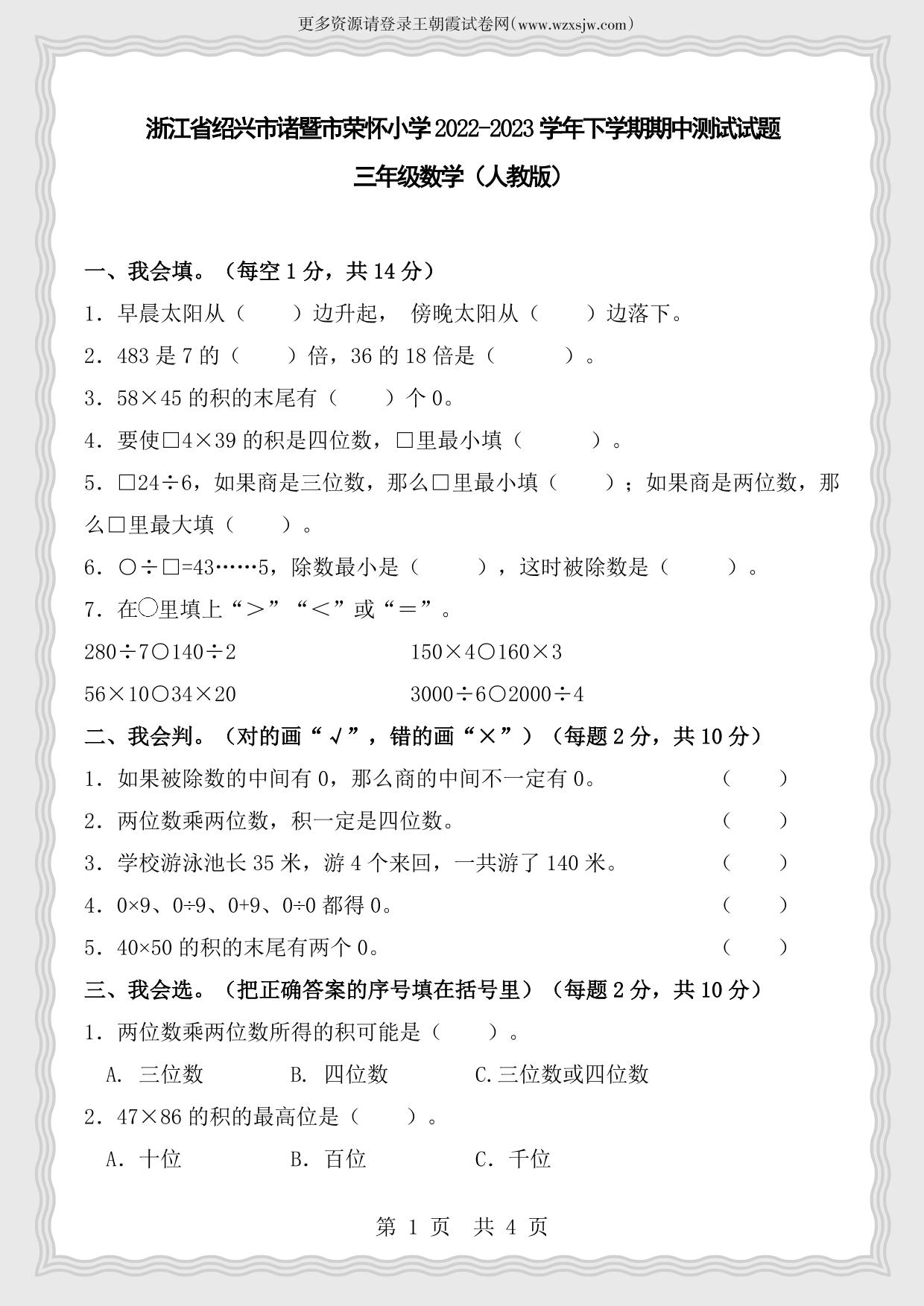 浙江省绍兴市诸暨市荣怀小学2022-2023学年下学期期中测试试题三年级数学(人教版)