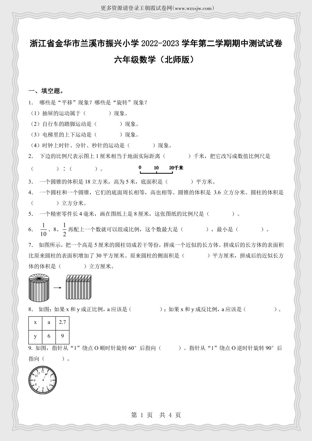 浙江省金华市兰溪市振兴小学2022-2023学年第二学期期中测试试卷六年级数学(北师版)
