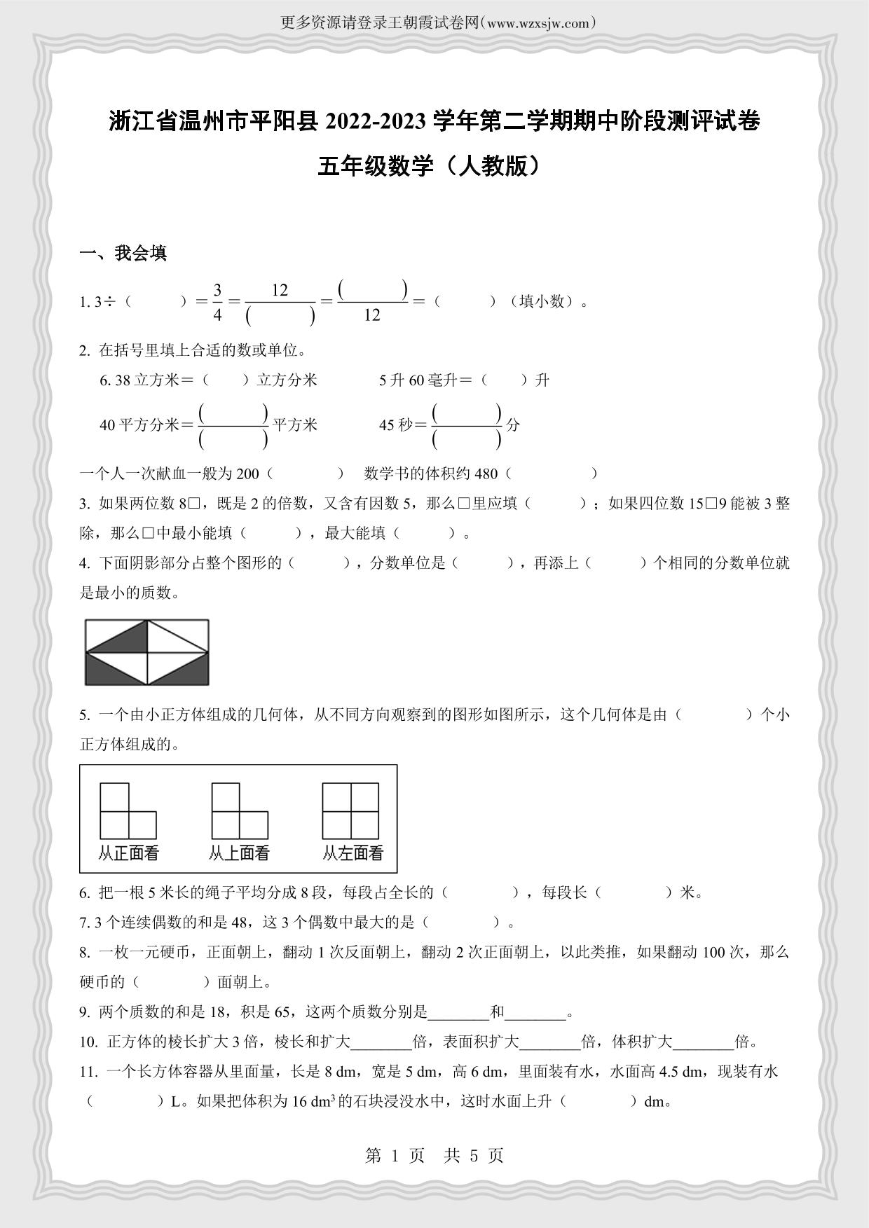 浙江省温州市平阳县2022-2023学年第二学期期中阶段测评试卷五年级数学(人教版)