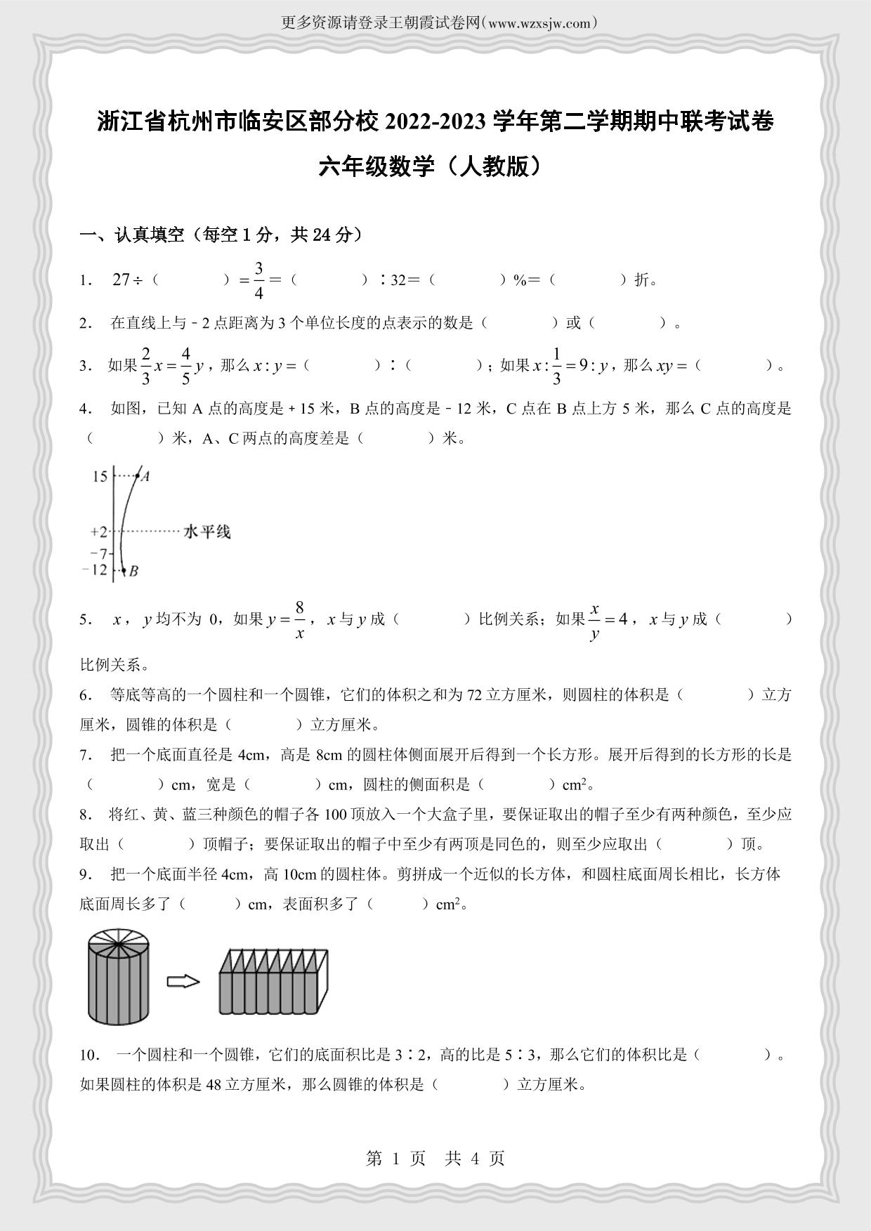 浙江省杭州市临安区部分校2022-2023学年第二学期期中联考试卷六年级数学(人教版)