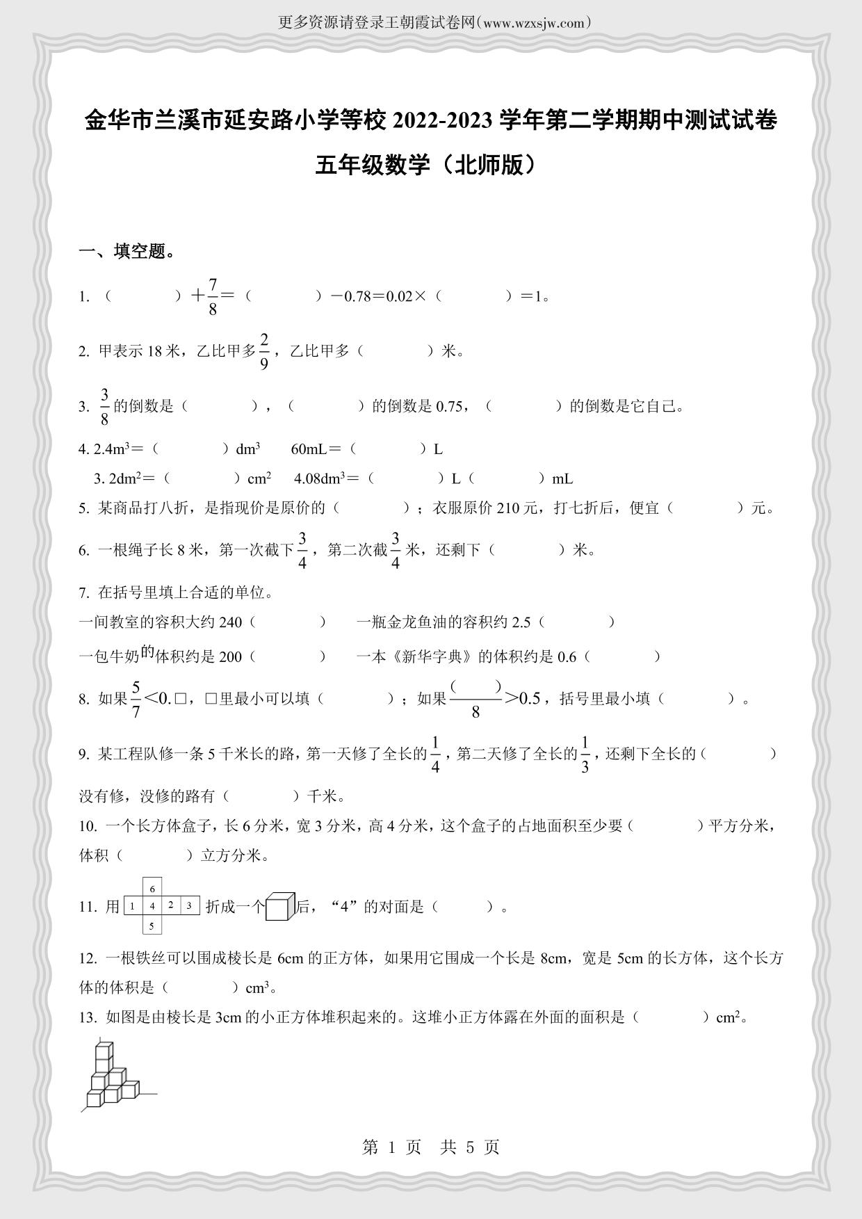 浙江省金华市兰溪市延安路小学等校2022-2023学年第二学期期中测试试卷五年级数学(北师版)