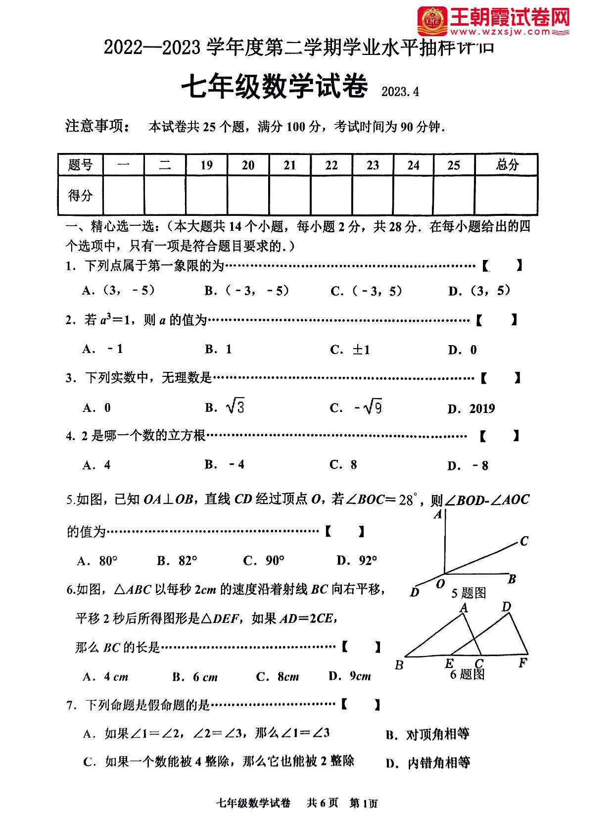 河北省唐山市路南区2022-2023学年度第二学期期中学业水平抽样评估试卷七年级数学(人教版)