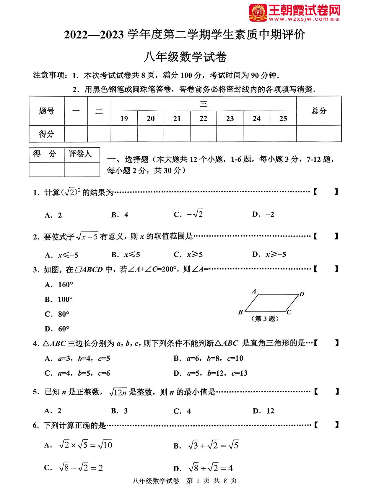 河北省唐山市古冶区2022-2023学年度第二学期学生素质中期评价试卷八年级数学(人教版)