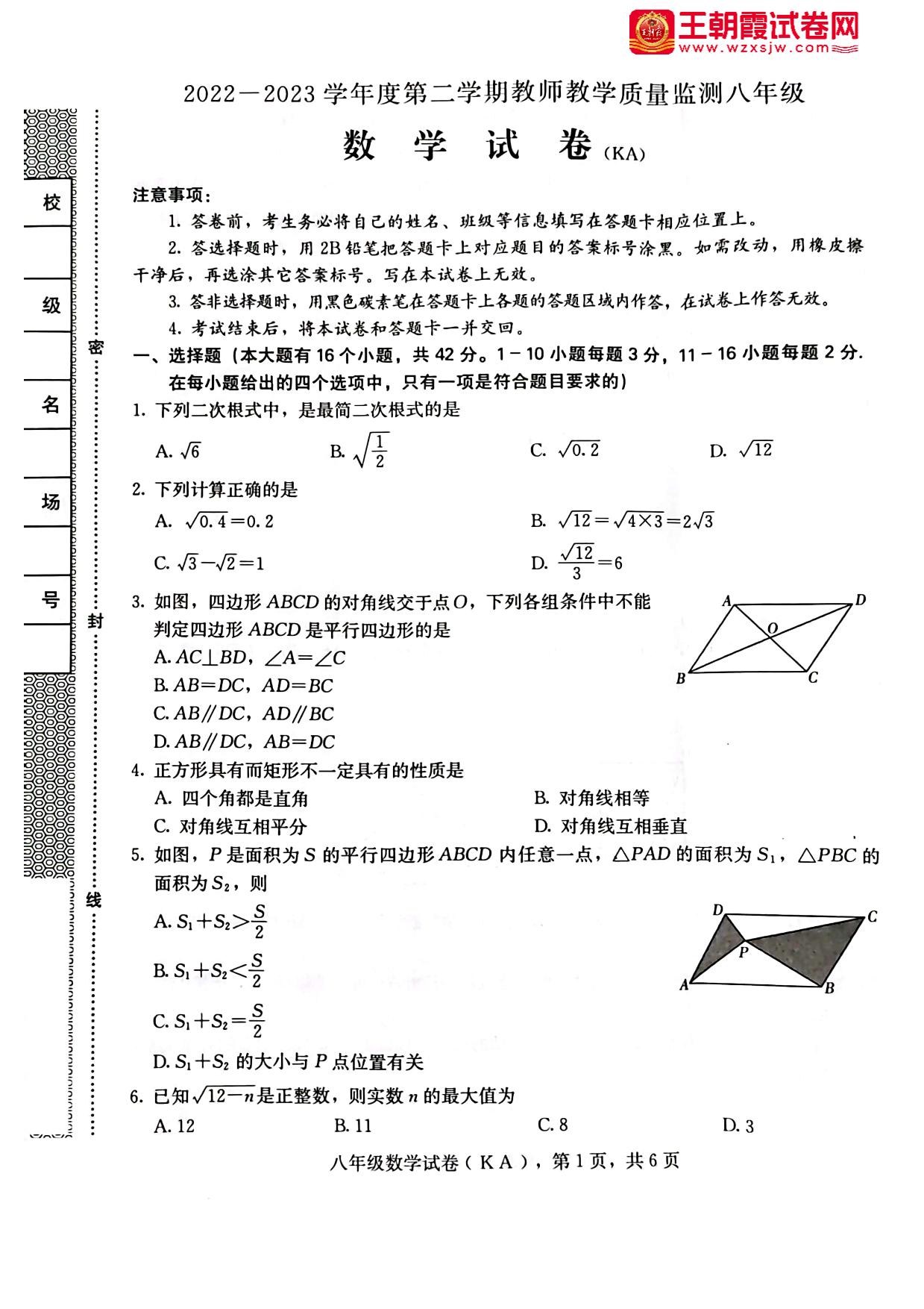 河北省石家庄市赵县2022-2023学年度第二学期教师教学质量监测期中试卷八年级数学(人教版)