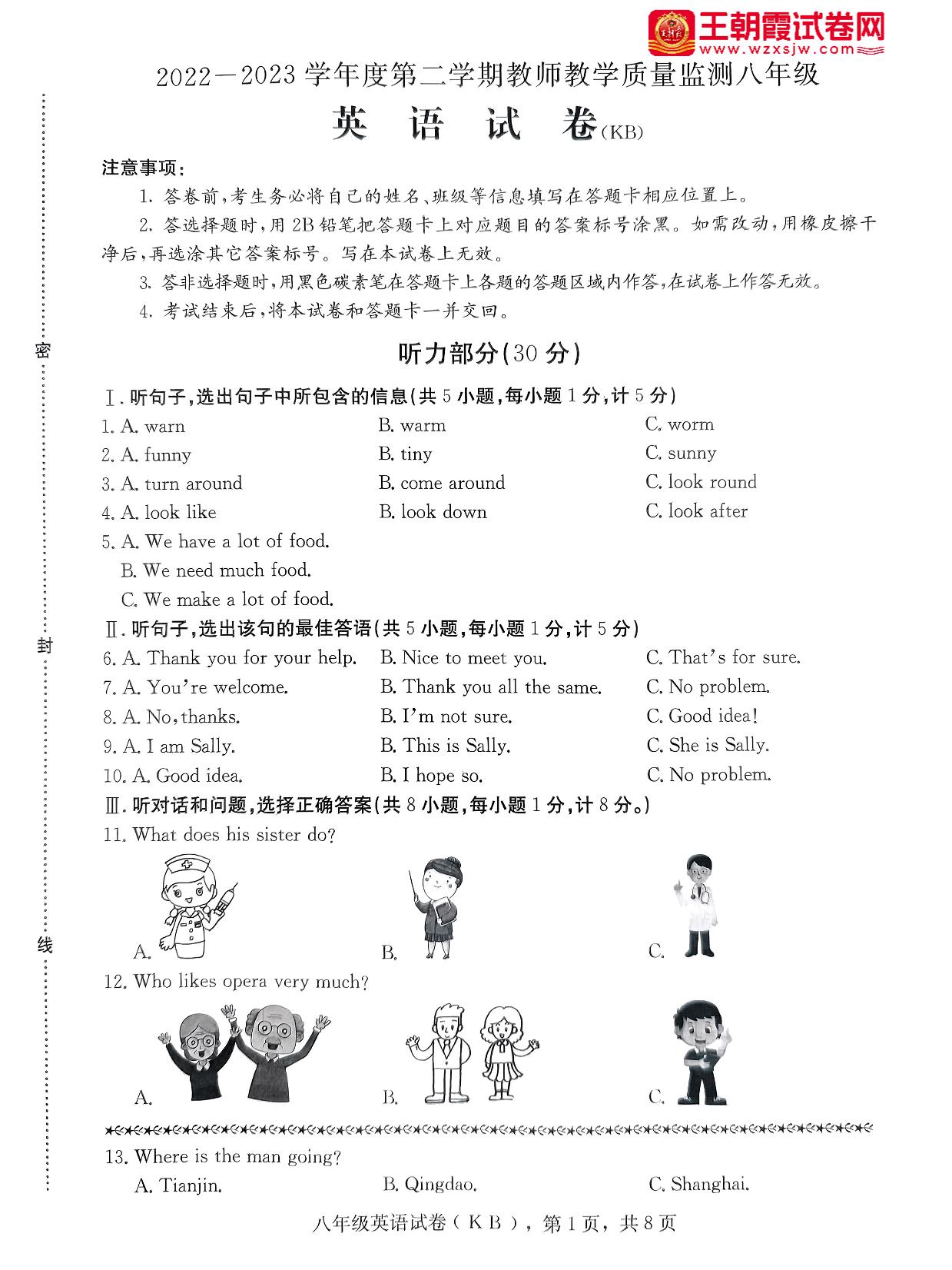河北省保定市清苑区2022-2023学年度第二学期教师教学质量监测期中试卷八年级英语(冀教版)