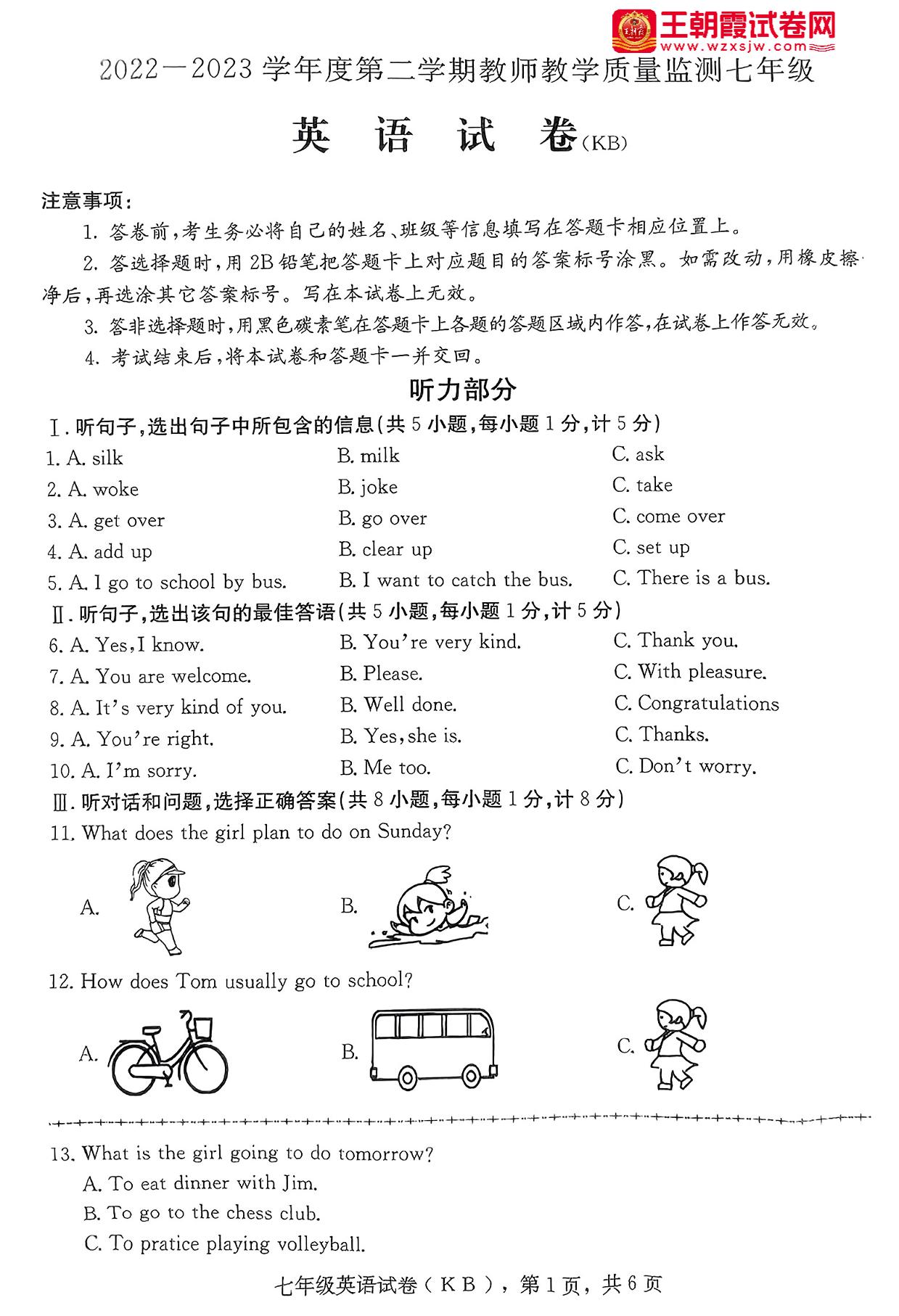 河北省保定市清苑区2022-2023学年度第二学期教师教学质量监测期中试卷七年级英语(冀教版)