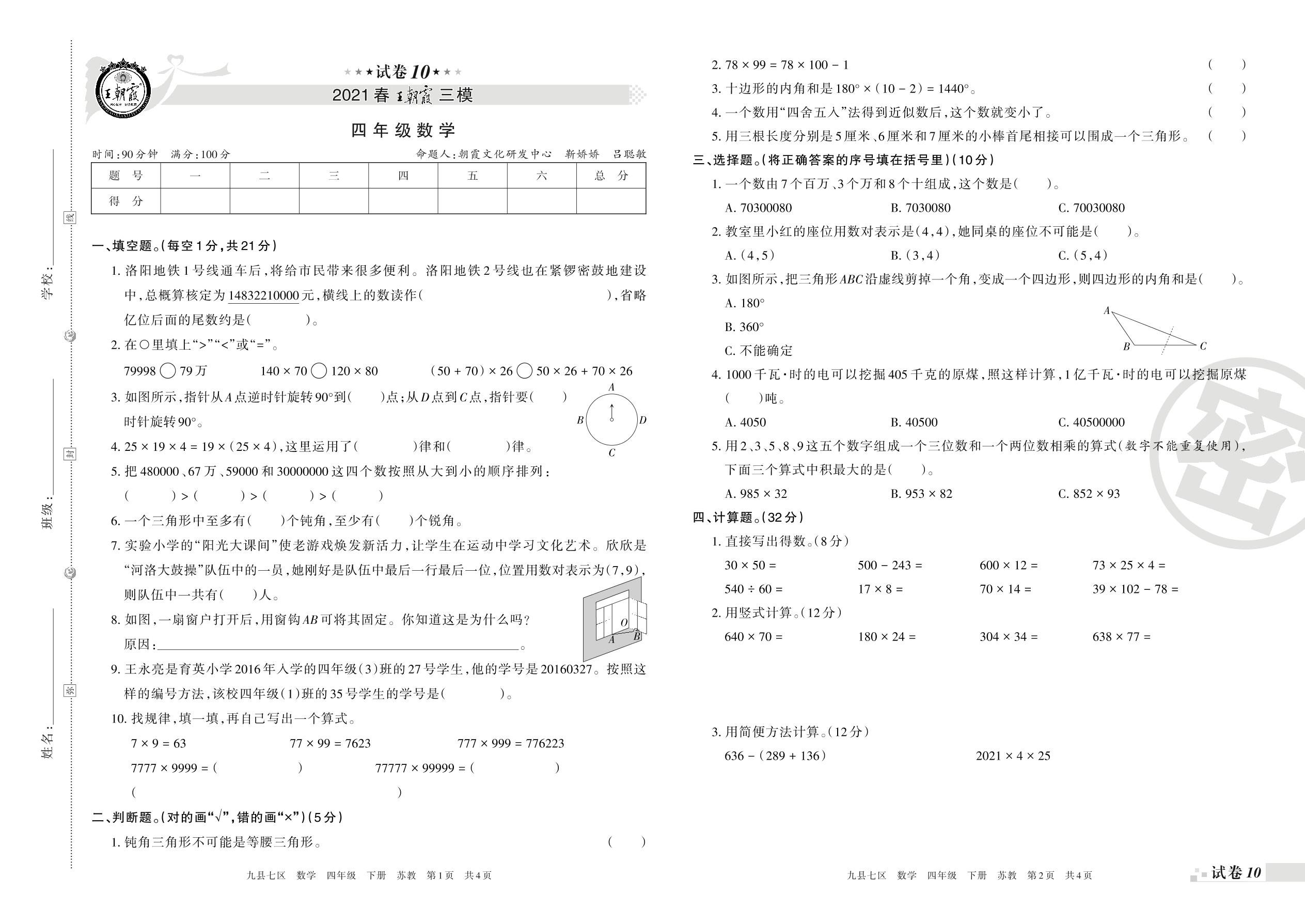 王朝霞期末模拟卷四年级下册数学(苏教版)_R210804134621【10】