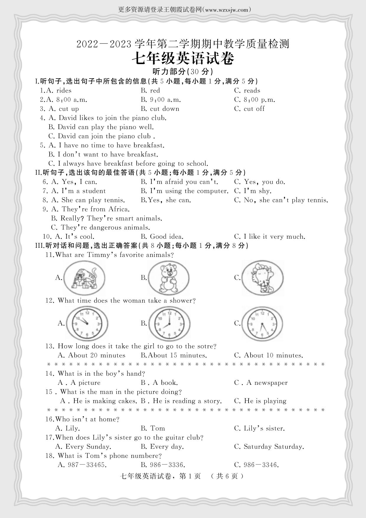 河北省石家庄市高邑县2022-2023学年第二学期期中教学质量检测试卷七年级英语(人教版)【无听力音频】