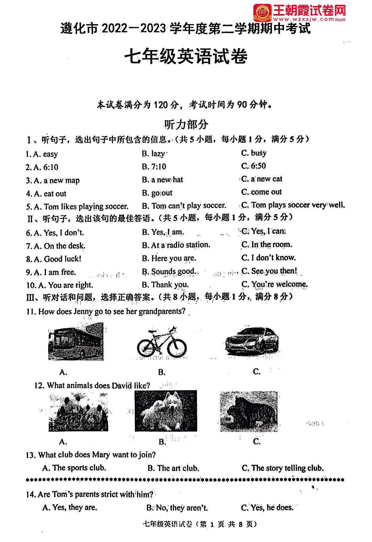 河北省唐山市遵化市2022-2023学年度第二学期期中考试试卷七年级英语(人教版)